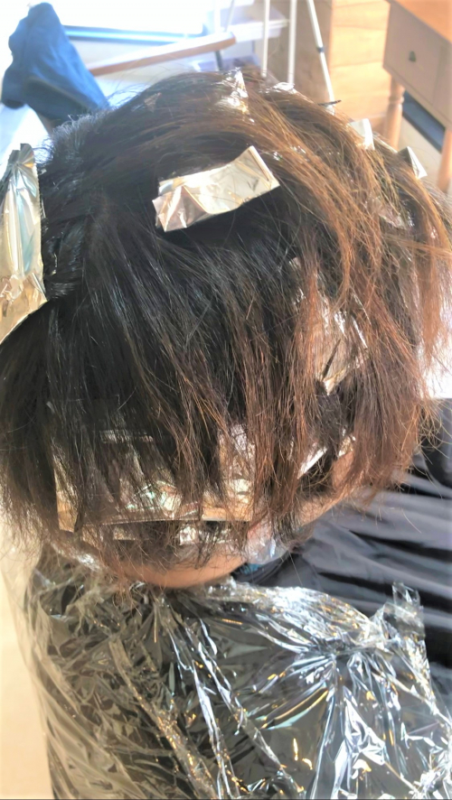 この上から全体カラーを施し、ブリーチ部分にも色をしっかりいれて、色持ち重視でデザインします。