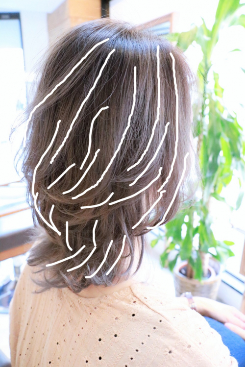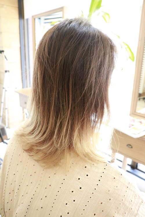 画像の通り、毛流れに沿うようにブリーチ施術を施しているので、カラーの抜け感とともに